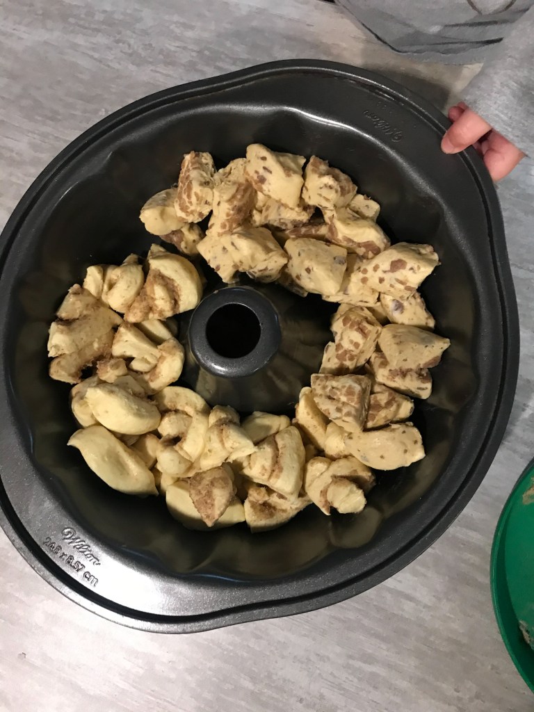 - Evenly sprinkle the quartered dough into the bundt pan (we do 1 can orange rolls and 1 can cinnamon and put each can in half of the pan)