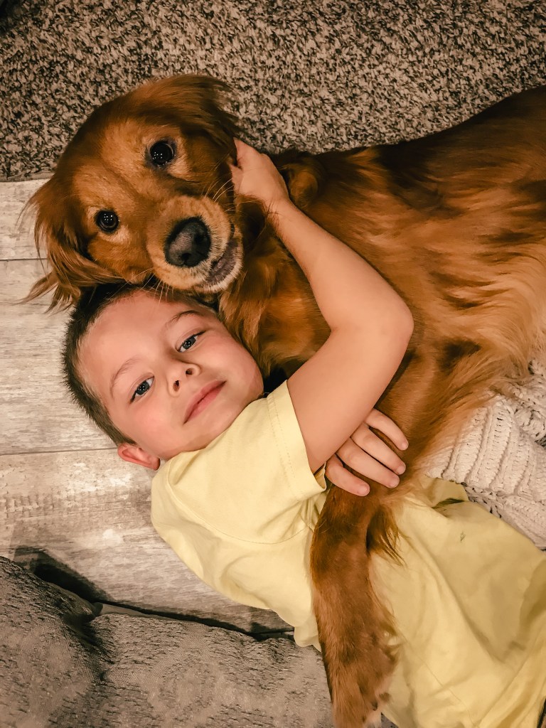 George is a two-year-old miniature golden retriever and FULL of energy. He loves playing with the kids, being with us as much as possible and carrying around his chew toys.